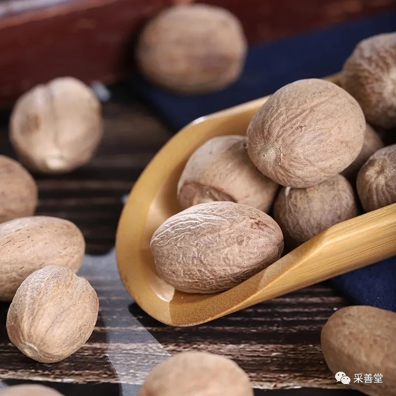 性狀:呈卵圓形或橢圓形,長(zhǎng)2~3cm,直徑1.5~2.5cm,。表面灰棕色或灰黃色,有時(shí)外被白粉(石灰粉末)。全體有淺色縱行溝紋和不規(guī)則網(wǎng)狀溝紋。種臍位于寬端,呈淺色圓形突起,合點(diǎn)呈暗凹陷。種脊呈縱溝狀,連接兩端。質(zhì)堅(jiān),斷面顯棕黃色相雜的大理石花紋,寬端可見(jiàn)干燥皺縮的胚,富油性。氣香濃烈,味辛。