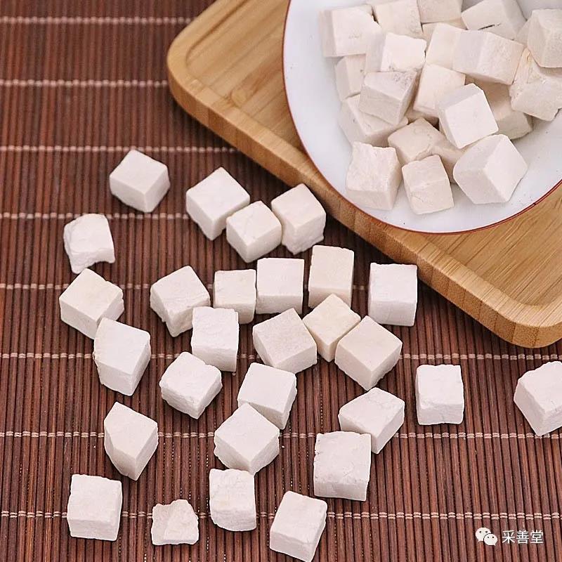 【性狀】呈類球形、橢圓形、扁圓形或不規(guī)則團塊,大小不一。外皮薄而粗糙,棕褐色至黑褐色,有明顯的皺縮紋理。體重,質(zhì)堅實,斷面顆粒性,有的具裂隙,外層淡棕色,內(nèi)部白色,少數(shù)淡紅色,有的中間抱有松根。氣微,味淡,嚼之粘牙。為去皮后切制的茯苓,呈立方塊狀或方塊狀厚片,大小不一。白色、淡紅色或淡棕色。